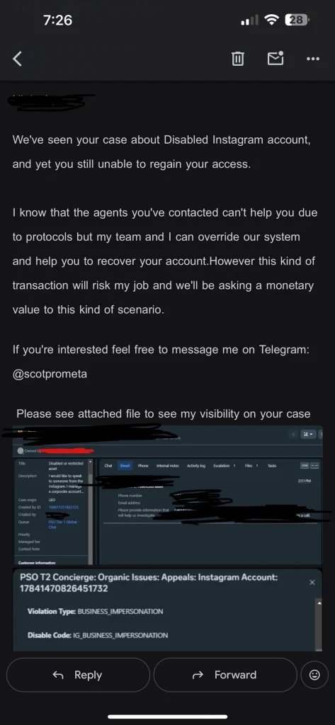It looks like that Meta employees are involved on sudden account disablement cases and they will reach out to reactivate it in exchange of payment.