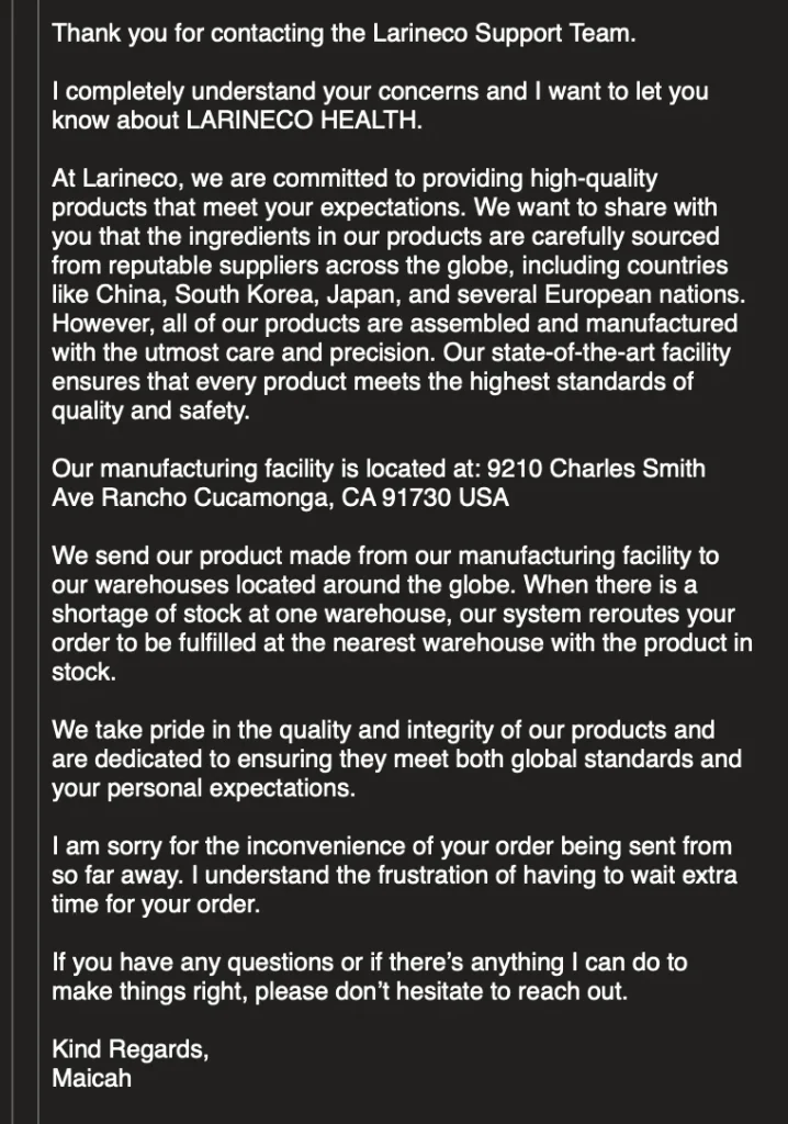 They first lied to me saying that they manufacture their gum in USA. So I ordered from them. Then my package came from China. It took 4 weeks to get to me. The packaging has zero “made in” country label on it. If Im not misunderstood I believe all food has to have a country of origin.